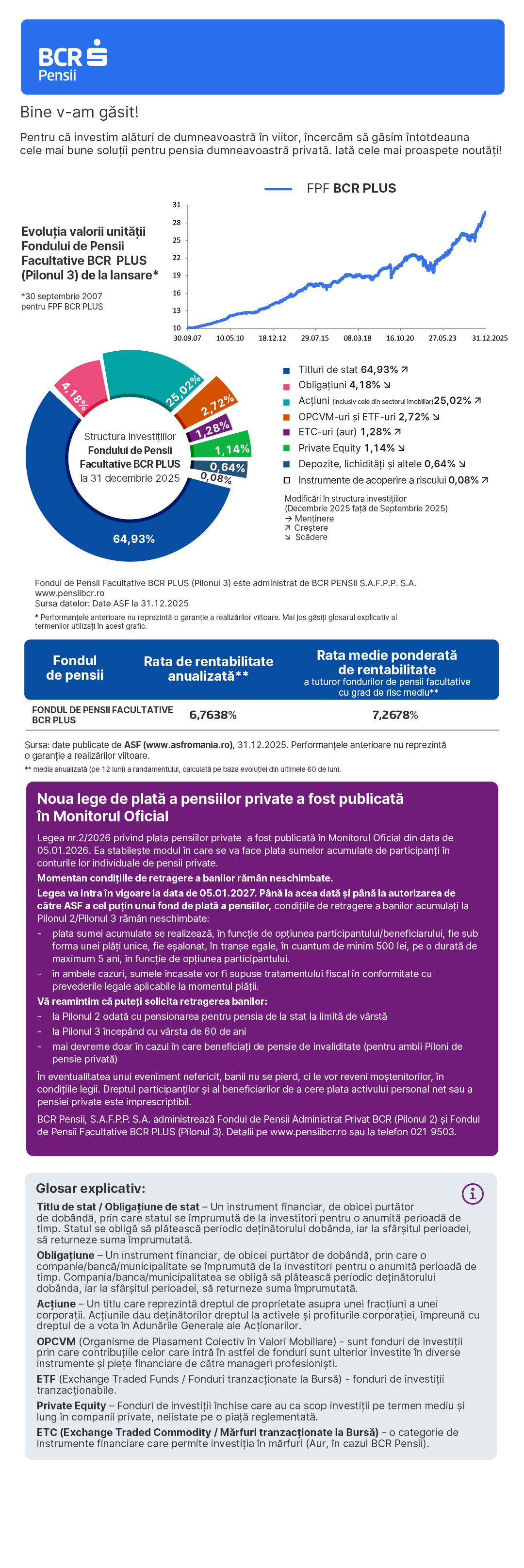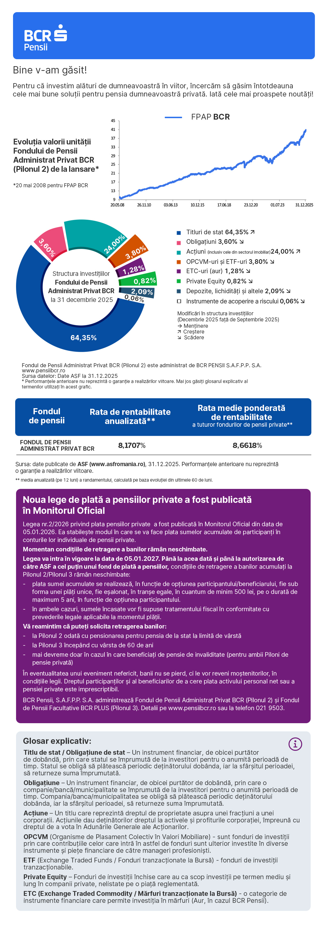 Află aici cele mai proaspete informații despre pensia ta privată Pilon 2 / Pilon 3 de la BCR Pensii și rezultatele înregistrate la decembrie 2025